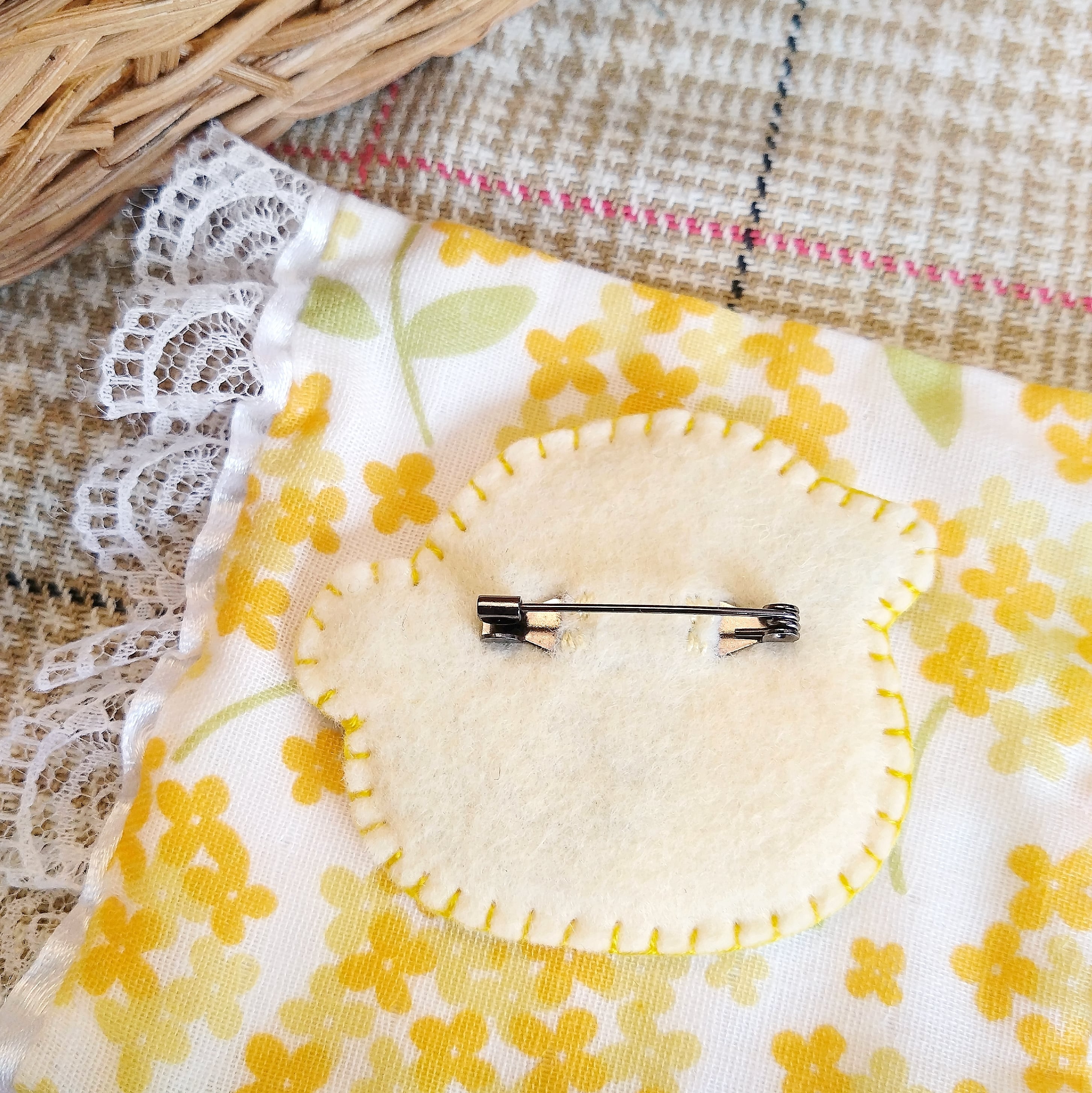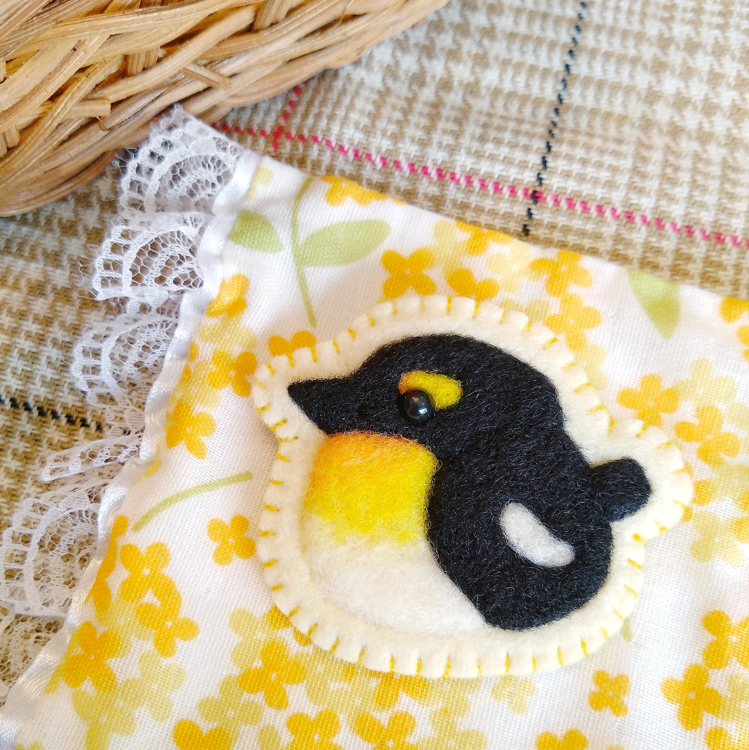 アップリケ風のバッジです。 シートフェルトにニードルフェルトでぷっくり立体感を出しています。 眉毛がキュートなキビタキさん。 サイズ:約5.3×6.3㎝